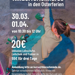 Die Osterferien stehen vor der Tür! Natürlich bieten wir wieder Kinderferienkurse an. ➡️ Von 10:30 bis 12:00 Uhr (Bei hoher Nachfrage kann es vorkommen, dass ein zweiter Kurs von 12:30 bis 14 Uhr angeboten wird.)➡️ 1 Tag für 20€ oder 3 Tage für 55€, inklusive Schuhe, Chalk und Betreuung durch Trainer:in An folgenden Terminen finden[…]