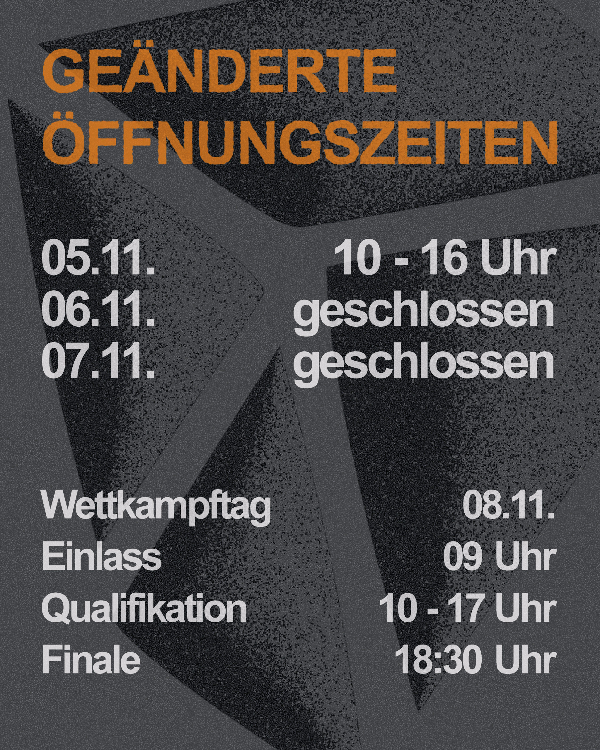 Für die Vorbereitung des SchmiedeCups werden wir die Halle nächste Woche Mittwoch 16 Uhr schließen. Donnerstag und Freitag wird geschraubt und die Halle bleibt zu. Am Samstag öffnen wir 09 Uhr unsere Tore und erwarten euch ab 10 auf der Matte für die Quali. Vor allem für das Finale ab 18:30 sind Zuschauer:innen ausdrücklich gewünscht!