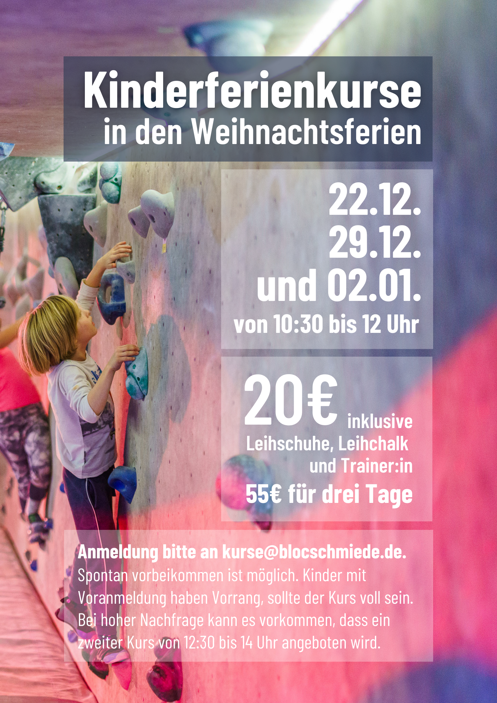 ➡️ 1 Tag für 20€ oder 3 Tage für 55€, inklusive Schuhe, Chalk und Betreuung durch Trainer:in